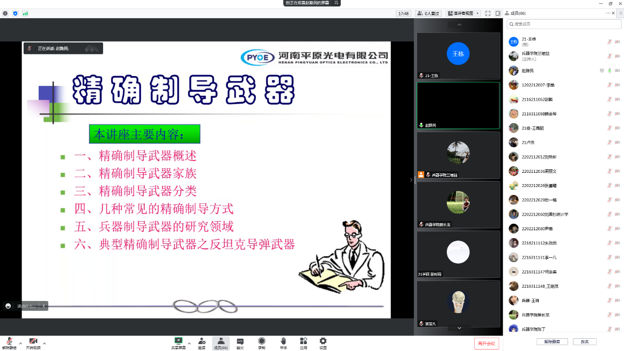 2022年12月2日上午9:30,河南平原光电有限公司赵路民研高工应邀为新葡官网作题为“精确制导武器系统”的线上讲座。本次讲座由教学院长蔡长龙主持,院长郭永春、学院教师及全体研究生参加讲座。