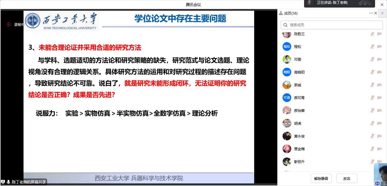 讲座题目:西安工大硕士研究生学位论文写作规范,主讲人:陈丁,博士、高级工程师、硕士生导师。主要研究方向:兵器数字化试验测试技术、雷达系统总体设计与建模。中国电子学会高级会员、中国仪器仪表学会高级会员、IEEE会员,多个SCI及中文核心期刊评审专家。发表学术论文90余篇,其中SCI、EI收录20余篇。多次获得相关学术会议、科技成果奖。