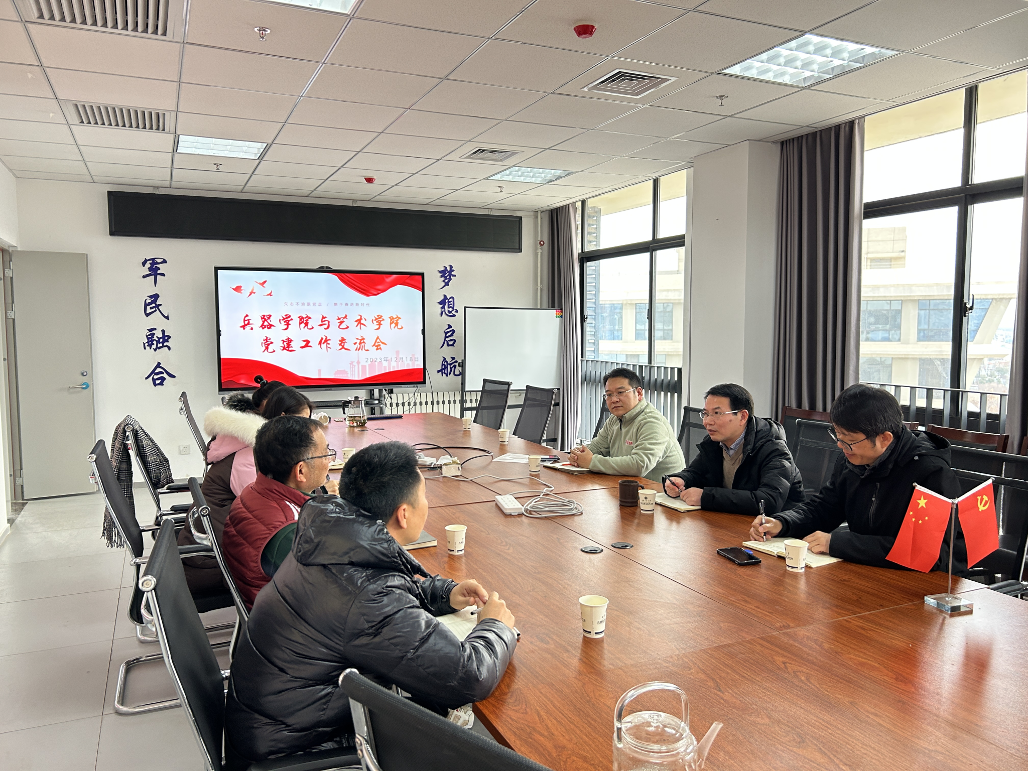 2023年12月18日下午2:30分,3003新葡平台登录入口党委书记蔡长龙、党委组织委员陈丁、辅导员王国栋与来访的艺术与传媒学院党委书记周著一行四人与在3003新葡平台登录入口8-615会议开展两院党建工作交流。