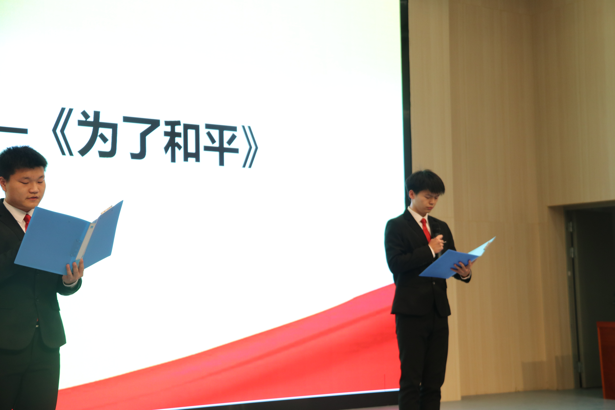 第五项内容:刘纯焱同学和孙稀岩同学为大家进行冷兵器知识朗诵《为了和平》