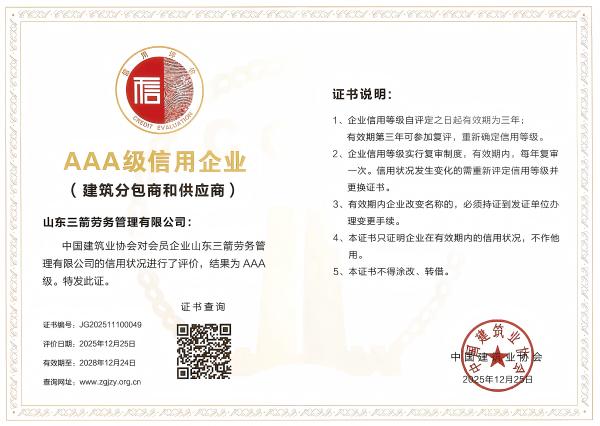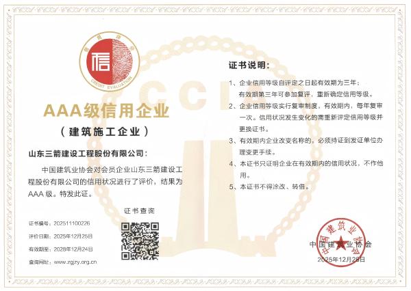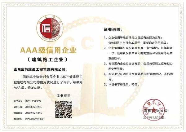 三箭建设股份公司作为集团骨干企业,是全国质量信得过单位”“全国守合同重信用企业”,具有建筑工程施工总承包特级等多项顶尖资质,承建项目多次获得“鲁班奖”“国家优质工程奖”等国家级奖项,此次获评是对其专业技术实力与行业声誉的再次肯定。三箭建设管理公司是“全国优秀施工企业”,曾凭借卓越的项目管理能力与优良的履约记录获评多项国家级诚信荣誉,此次评定进一步彰显了其规范管理、高效运营的企业形象。三箭劳务公司已连续十年保持“AAA级”信用等级,充分反映了其在劳务组织规范化、风险管控体系化以及技能人才培养专业化等多方面的深厚积淀与持续领先。